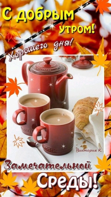 В эту осеннюю среду мы рады представить вам новую коллекцию самых красивых картинок с пожеланиями доброго утра. Яркие, сочные и оригинальные картинки Доброе утро среды предназначены для бесплатного скачивания и отправки через мессенджеры или соцсети. Так же вы можете сохранить их себе на телефон. В этой подборке вы найдете осенние картинки, а также традиционные изображения с кофе или чаем.