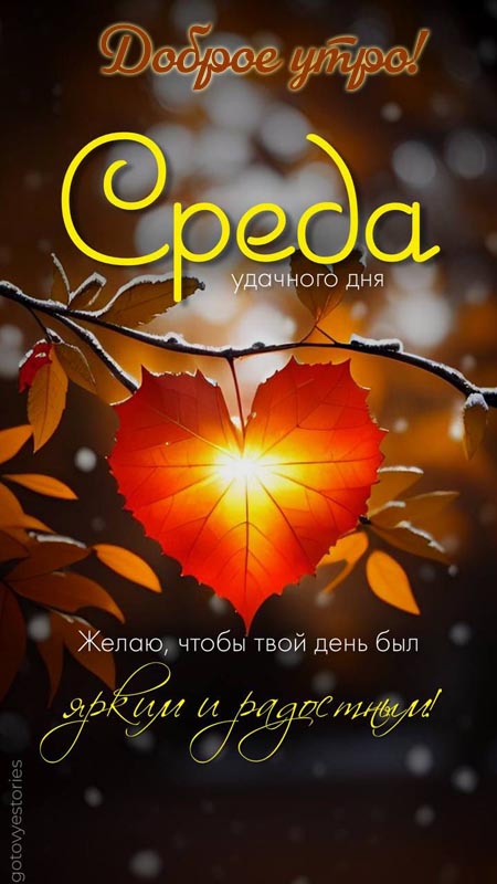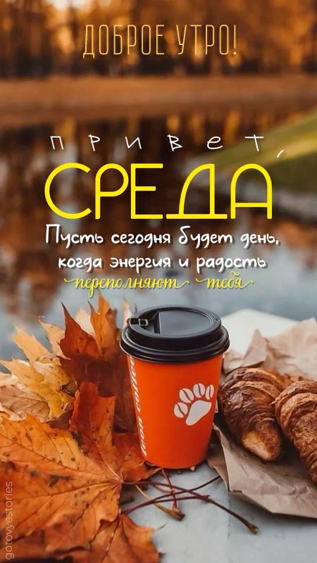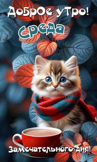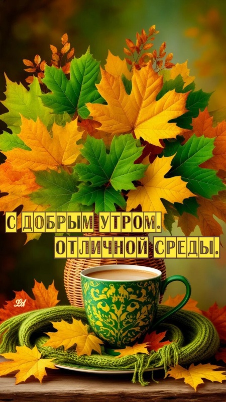 Ну вот мы и добрались до среды! Неделя набрала обороты, и самое время вдохнуть поглубже, налить себе чашку любимого кофе и улыбнуться этому дню. Пусть он будет тёплым, добрым и позитивным. А чтобы ваше осенне утро стало чуть ярче и радостней предлагаем картинки из нашей новой осенней коллекции «Доброе утро среды!». Они словно глоток свежего воздуха подарят уют и хорошее настроение. Скачайте бесплатно и отправьте любую из этих картинок друзьям, родным, любимым, коллегам или просто знакомым. И пусть ваше утро начнётся с улыбки и приятных новостей. Смотрите также новую коллекцию картинок "Доброе утро среды".