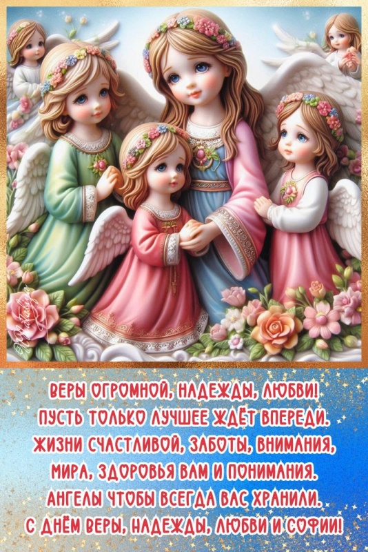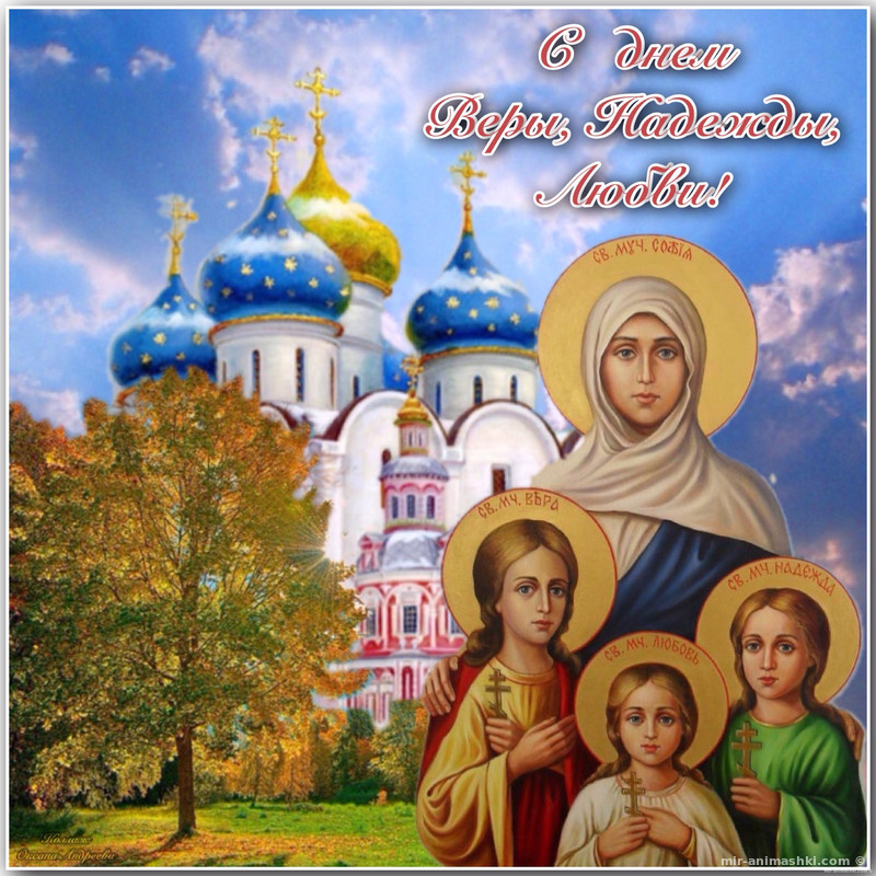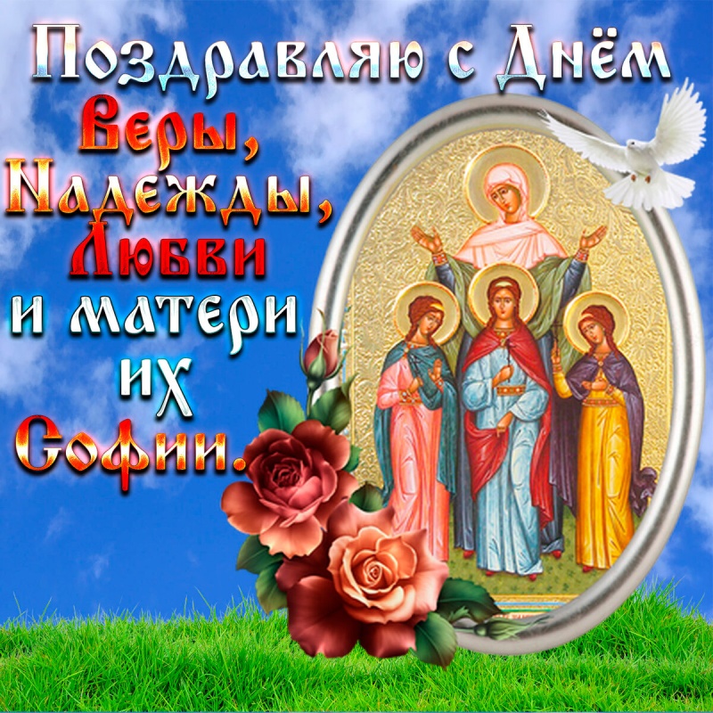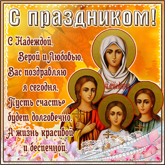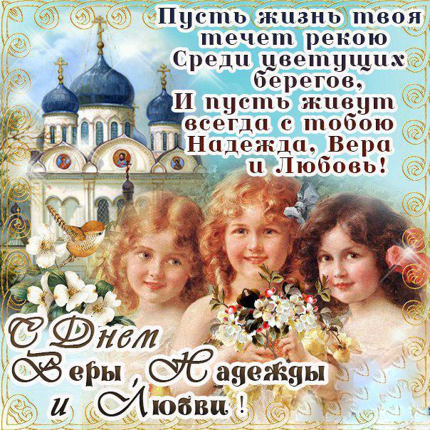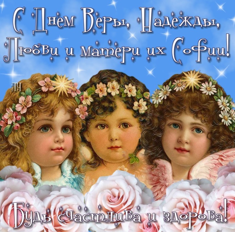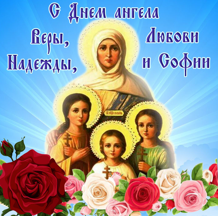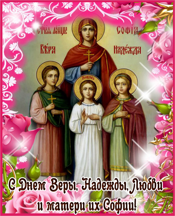 30 сентября, в День памяти святых мучениц Веры Надежды Любови и Софии отмечают Вселенские именины. Это значит, что обладательниц этих красивых имен нужно поздравлять с Днем Ангела. Мы собрали здесь самые красивые, интересные и новые открытки с Днем ангела Веры Надежды Любви и Софии. Скачав их бесплатно, вы можете отправить красивое поздравление в картинках своим знакомым или родным именинницам. Смотрите также красивые и новые открытки на День Веры Надежды Любови и Софии.
