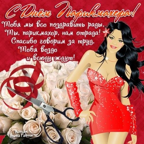 День парикмахера в России отмечают День парикмахера. Мы поздравляем всех работников сферы паркмахерских услуг и желаем им хороших зарплаты и благодарных клиентов. Предлагаем скачать красивые картинки и открытки с Днем парикмахера и поздравить своих родных, друзей или просто ваших знакомых стилистов и мастров парикмахерского искусства.