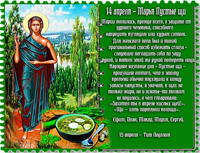 14 апреля - Марья - зажги снега (Марья - пустые щи). Отправьте картинку с поздравлениями или красивую открытку с Марьей - пустые щи (с Марьей - зажги снега) родным, близким, друзьям или коллегам.