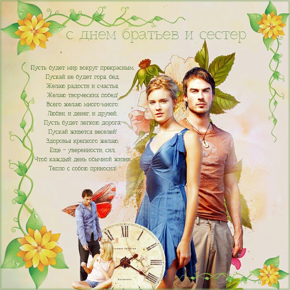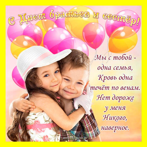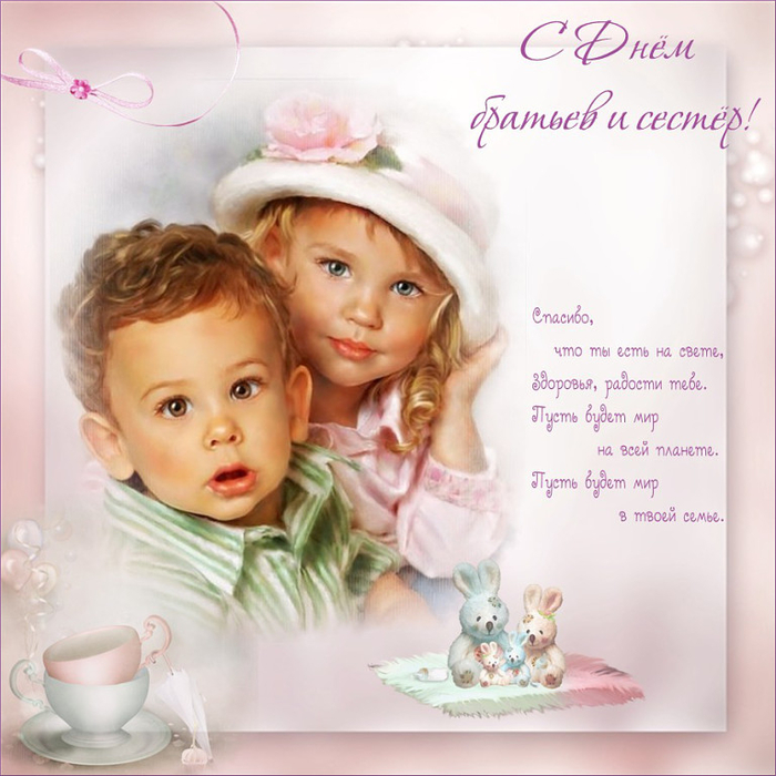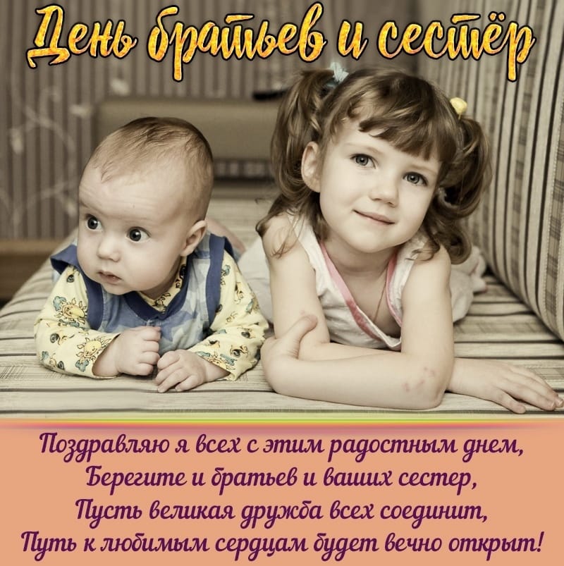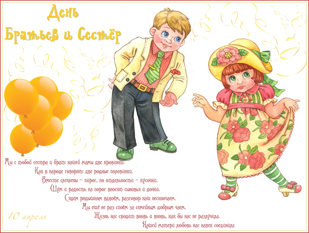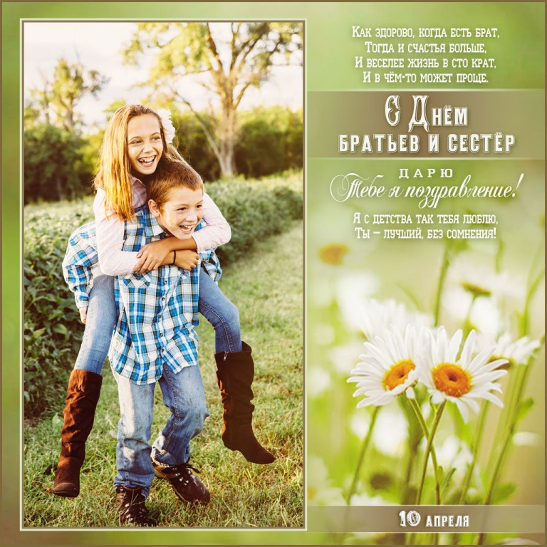 10 апреля - День братьев и сестёр. Отправьте картинку с поздравлениями или красивую открытку с Днём брата и сестры родным, близким, друзьям или коллегам.