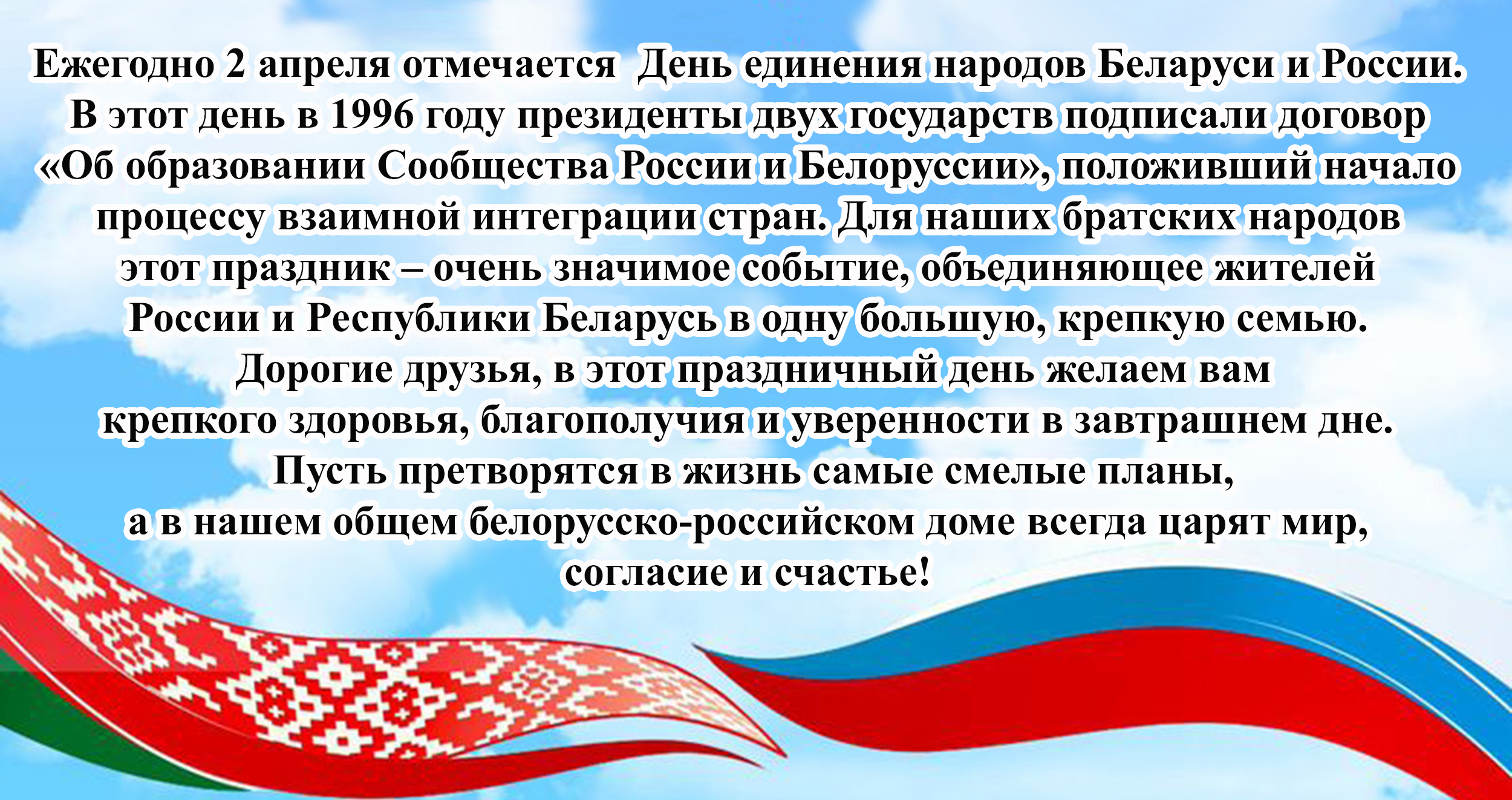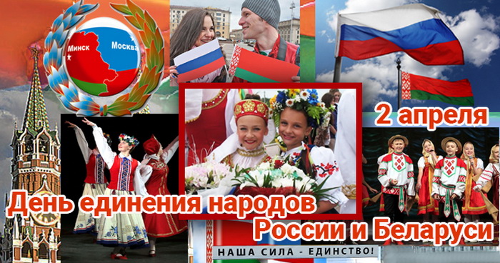 2 апреля - День единения народов Беларуси и России. Отправьте картинку с поздравлениями или красивую открытку с Днём единения народов Беларуси и России родным, близким, друзьям или коллегам.