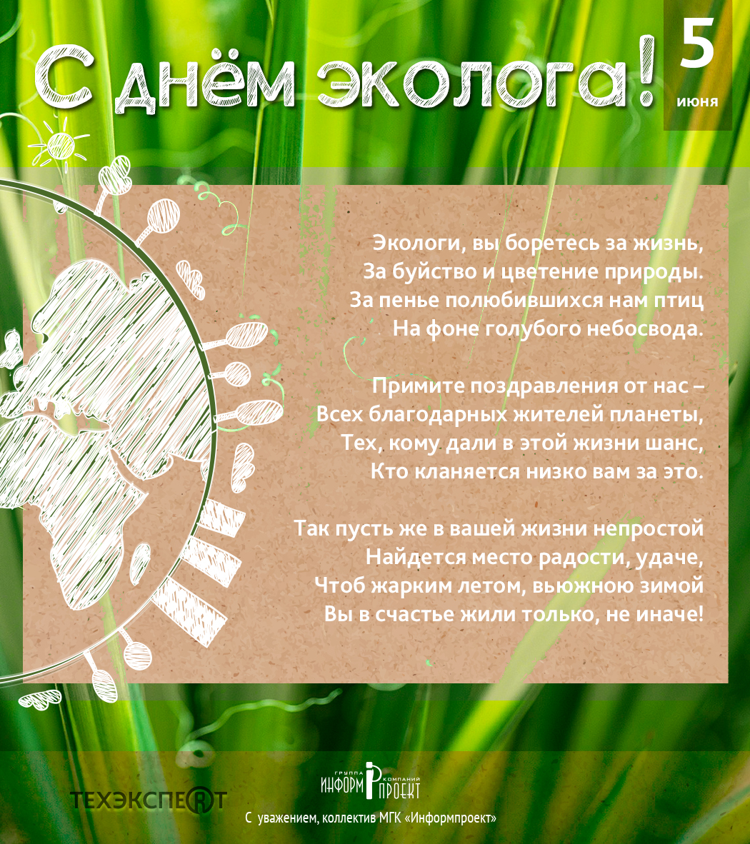 5 июня - День эколога. Отправьте картинку с поздравлениями или красивую открытку с Днём эколога родным, близким, друзьям или коллегам экологам. Смотрите также открытки со Всемирным днем охраны окружающей среды.