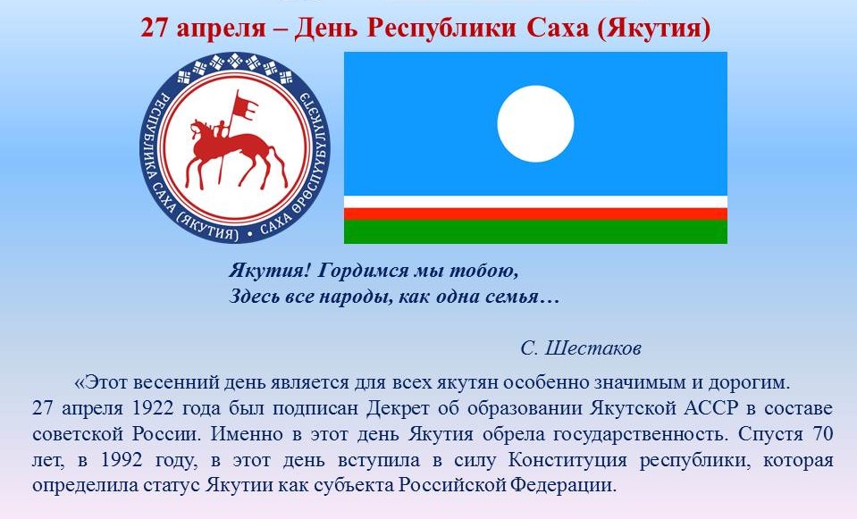 27 апреля - День образования Республики Саха (Якутия). Отправьте картинку с поздравлениями или красивую открытку с Днём Республики Саха (Якутия) родным, близким, друзьям или коллегам.