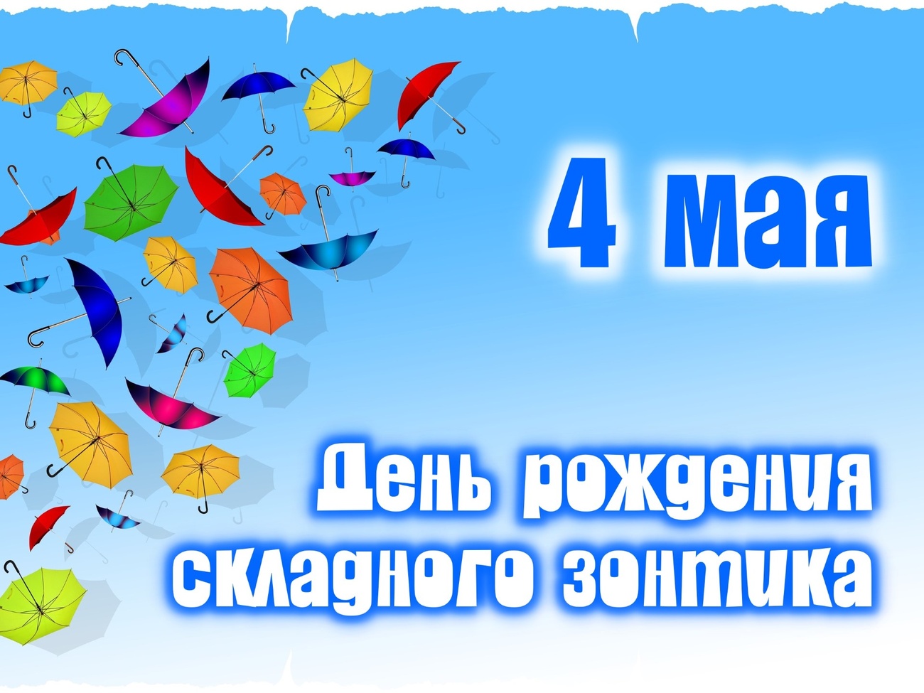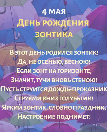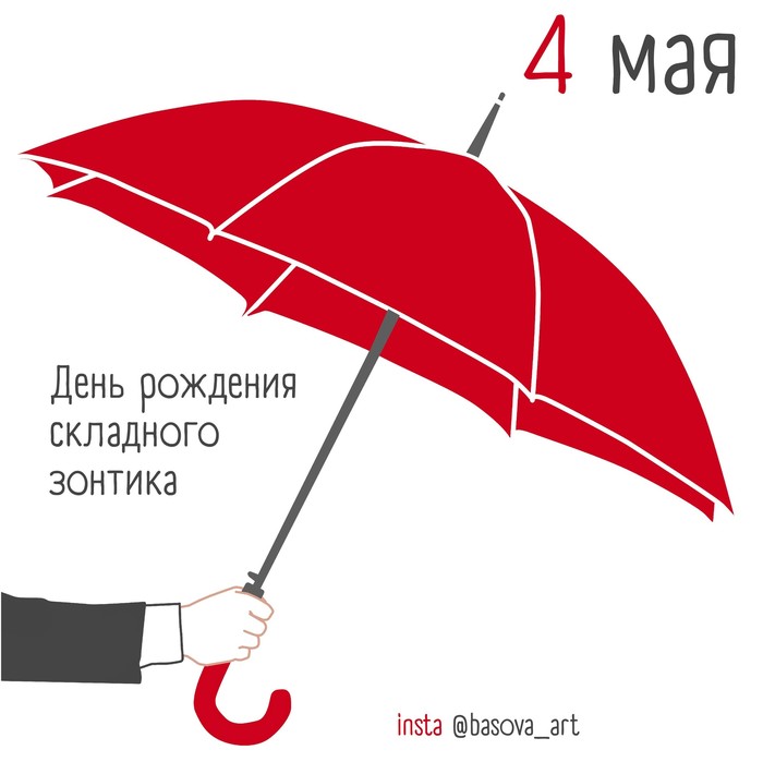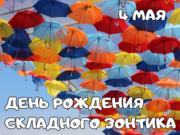 4 мая - День рождения складного зонтика. Отправьте картинку с поздравлениями или красивую открытку с Днём рождения складного зонтика родным, близким, друзьям или коллегам.