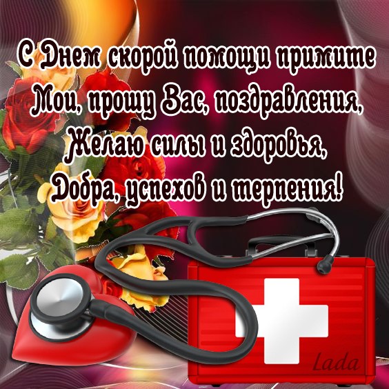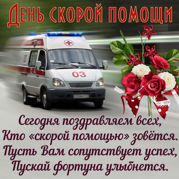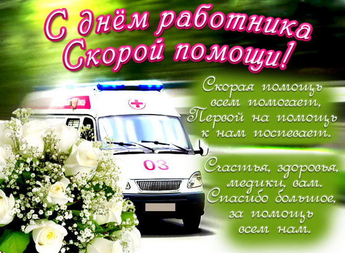 Поздравляю от чистого сердца с Днём скорой помощи. Пожелать в этот праздник хочу большой удачи в добрых делах и по-настоящему «скорой помощи» всем нуждающимся, успешной деятельности и только положительных результатов работы, огромных сил и бодрости души, искреннего уважения людей и щедрой благодарности судьбы.