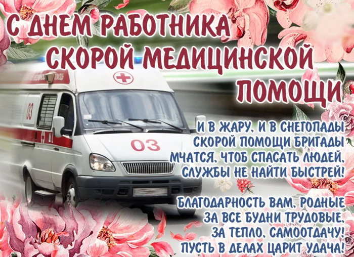 Поздравляю с профессиональным праздником! Пускай работа в скорой помощи приносит вам только радость, ведь вы спасаете жизни людей и дарите им хорошее самочувствие! Искренне желаю каждому сотруднику «скорой» огромного счастья, взаимной любви, отличной зарплаты и, конечно же, отменного здоровья!