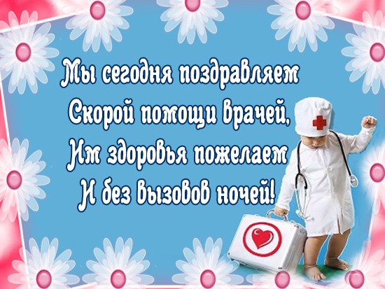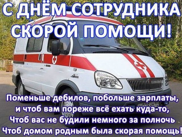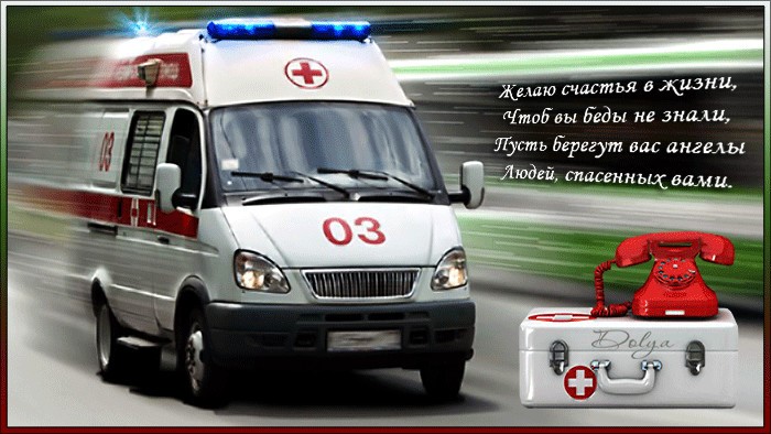 Поздравляю замечательных людей, которые первыми мчатся на помощь. Желаю вам всегда успевать на вызов и вовремя доставлять пациентов в больницу. Желаю поменьше сложных случаев и всегда благополучных исходов, полного выздоровления спасенных вами людей. Пускай звук мигалки и красный крест на белой машине всегда символизируют очень скорую, качественную и своевременную помощь пострадавшим. С праздником, настоящие герои в белых халатах! С Днем скорой помощи!