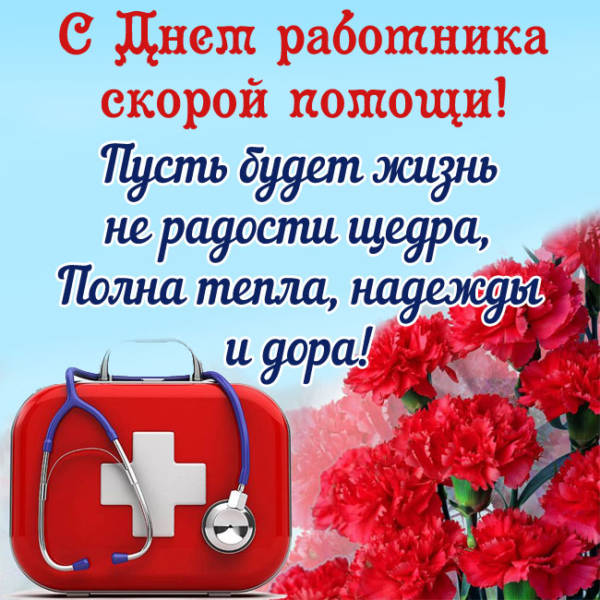 С замечательным праздником, Днем работников скорой медицинской помощи, уважаемые коллеги! Своим трудом вы каждый день совершаете маленькие чудеса, спасая людям жизни. Так пускай за вашу самоотдачу вас вознаградят небеса, чтобы в жизни вас ожидали большие успехи, а в работе великие свершения. Чтобы люди вам всегда были благодарны за спасенную жизнь. Чтобы судьба вас баловала. Удачи, выдержки, терпения, здоровья и всех благ.