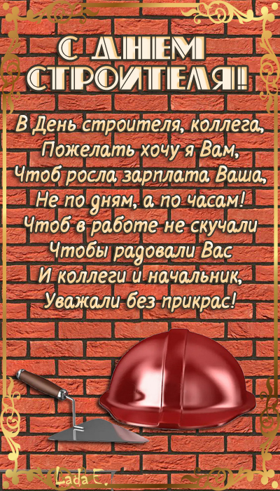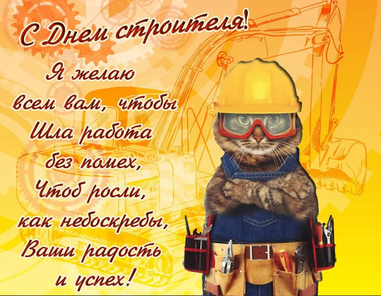 Собрали для вас прикольные открытки и картинки с поздравлениями на День строителя. Профессиональный праздник строителей отмечают во второе воскресенье августа ежегодно. В 2025 году этот день выпадает на 10 число. Наши открытки с изображением всевозможных атрибутов строительной тематики подойдут для поздравления как родных и близких, так и коллег и просто знакомых. Среди этих изображений есть как смешные, так и просто прикольные картинки с поздравлениями для строителей. Смотрите также Красивые и прикольные открытки на День строителя.