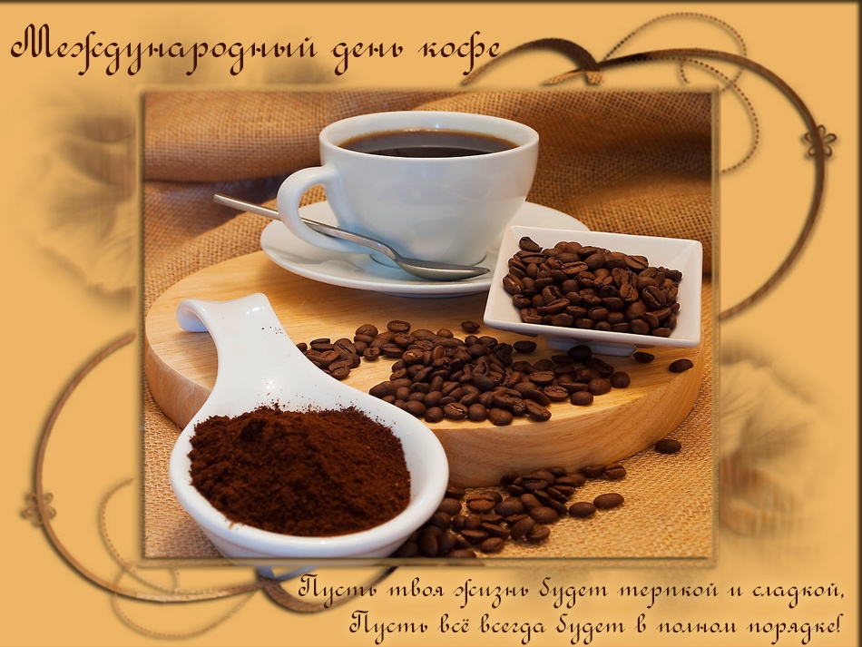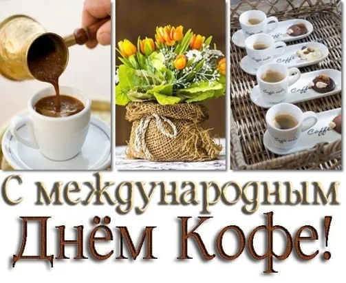 17 апреля, 29 сентября, 1 октября - Международный день кофе. Отправьте картинку с поздравлениями или красивую открытку с Международным днём кофе родным, близким, друзьям или коллегам.