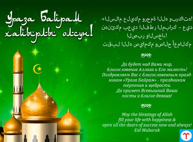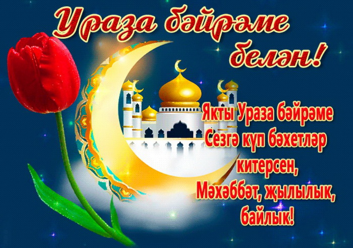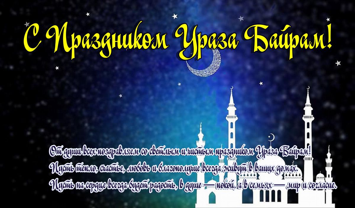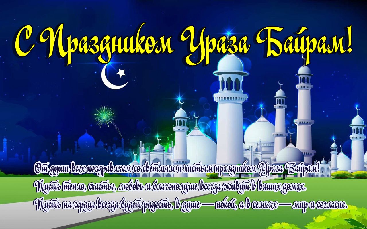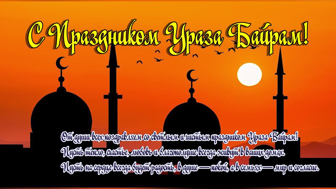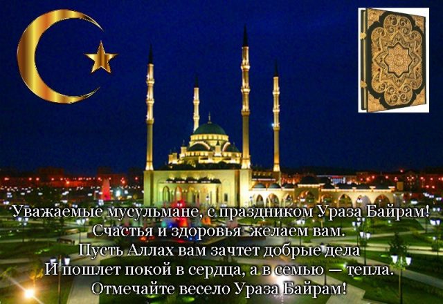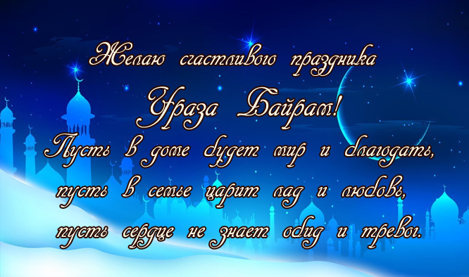 Ид мубарак. Желаю счастливого праздника Ураза Байрам. Пусть чистота твоих мыслей и доброта твоего сердца откликнется в радости и благополучии твоей жизни. Желаю здоровья всей твоей семье, верных друзей и искренней любви. Пусть Аллах дарует силы и терпение, а также светлую надежду и отраду души.