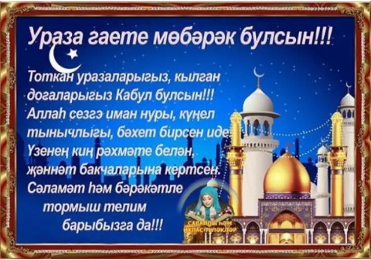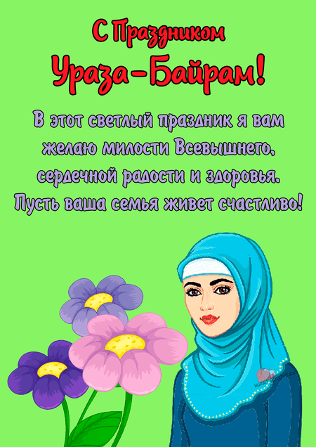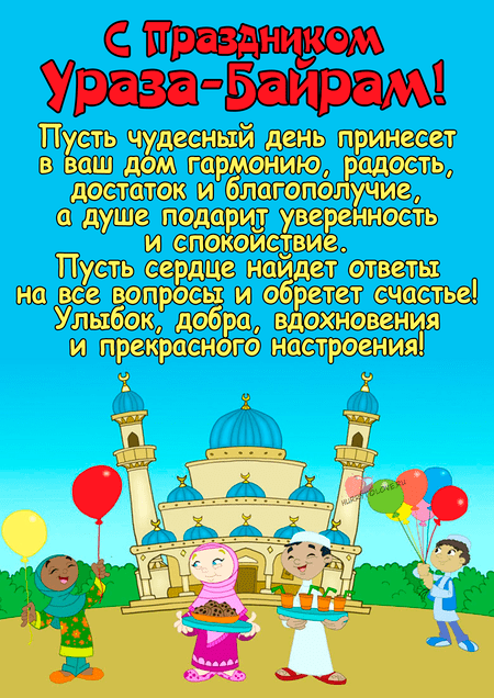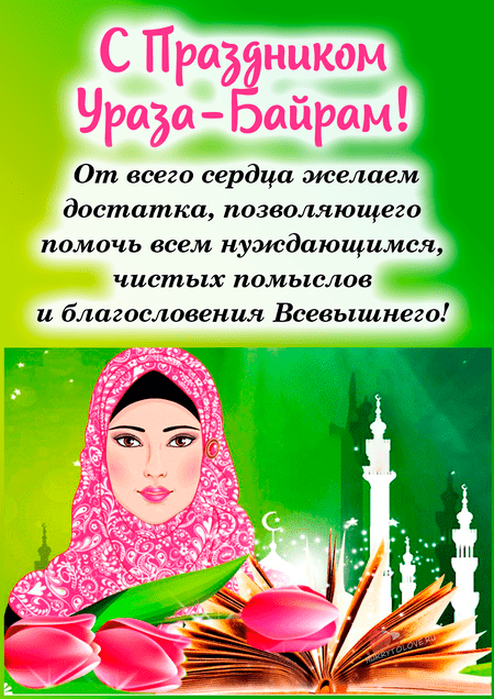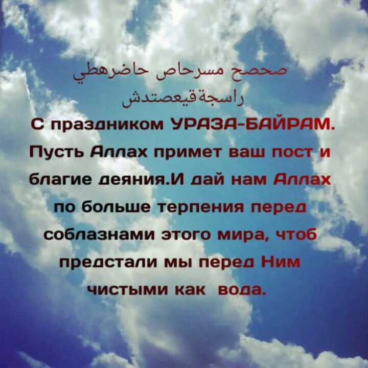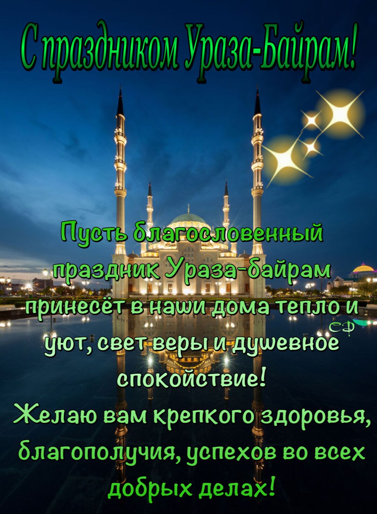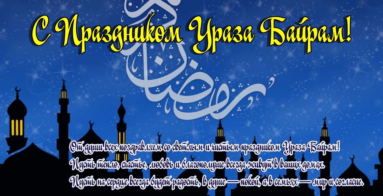 Ид мубарак. Желаю счастливого праздника Ураза Байрам. Пусть чистота твоих мыслей и доброта твоего сердца откликнется в радости и благополучии твоей жизни. Желаю здоровья всей твоей семье, верных друзей и искренней любви. Пусть Аллах дарует силы и терпение, а также светлую надежду и отраду души.